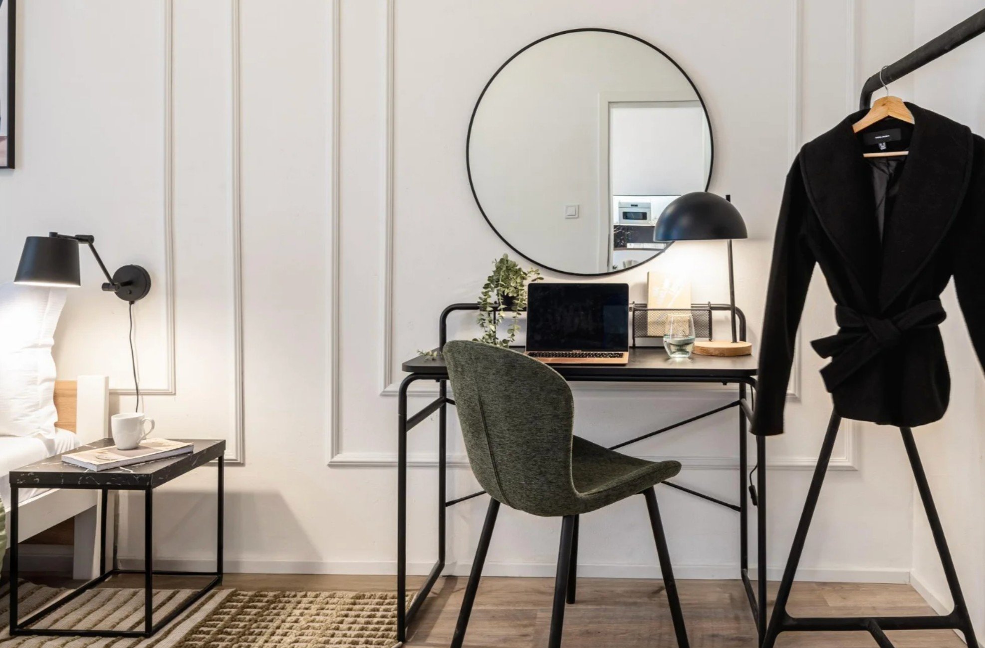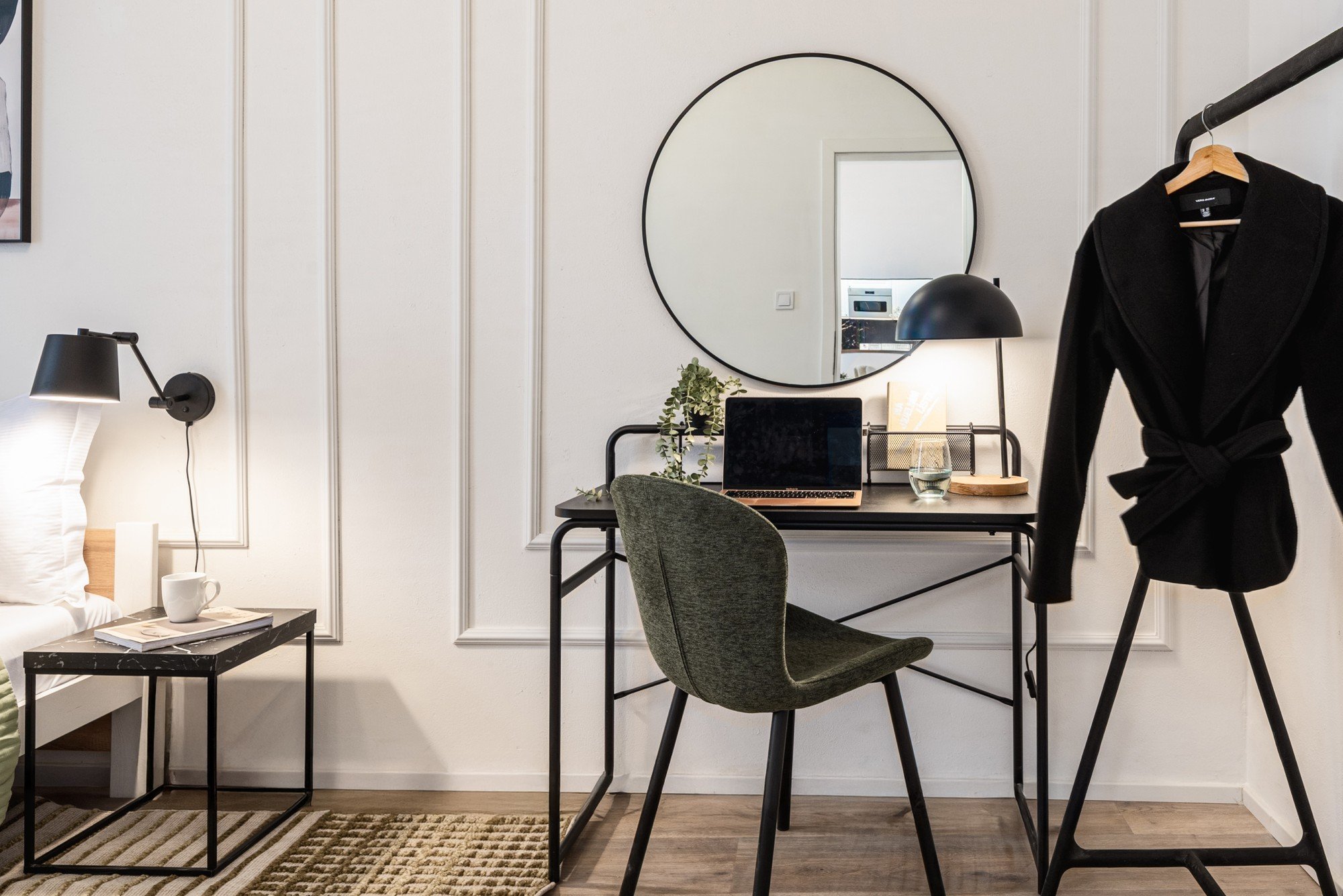 Rezultāts apstiprina, ka pat viena istaba var izskatīties gaisīga, mierīga un vienlaikus piedāvāt pilnvērtīgu vietu darbam un atpūtai.