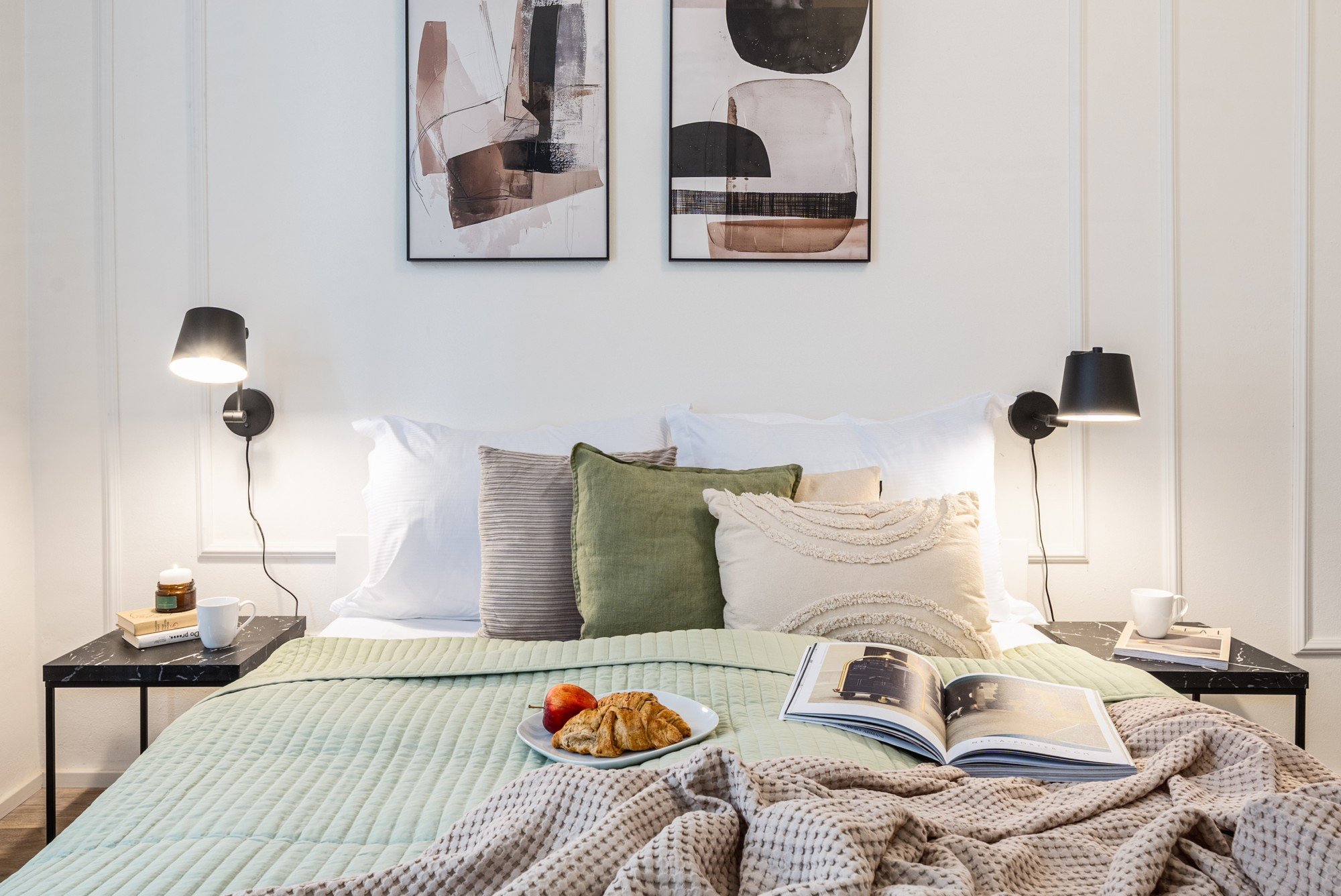 Trīsistabu dzīvokļa pilnīga iekārtošana tika veikta, respektējot tā raksturu un esošos elementus. Dekoratīvās līstes, zelta akcenti un izteiksmīgi dīvāni, kas jau bija interjera daļa, kļuva par visa koncepta sākumpunktu. Projektā tika likts uzsvars uz gaismu, funkcionalitāti un vizuālo pievilcību, lai dzīvoklis būtu ne tikai estētisks, bet arī praktisks īstermiņa īrei.