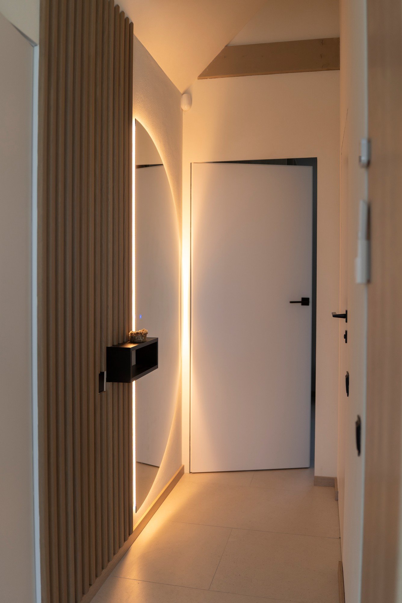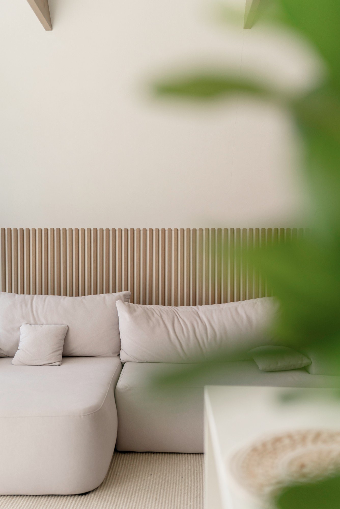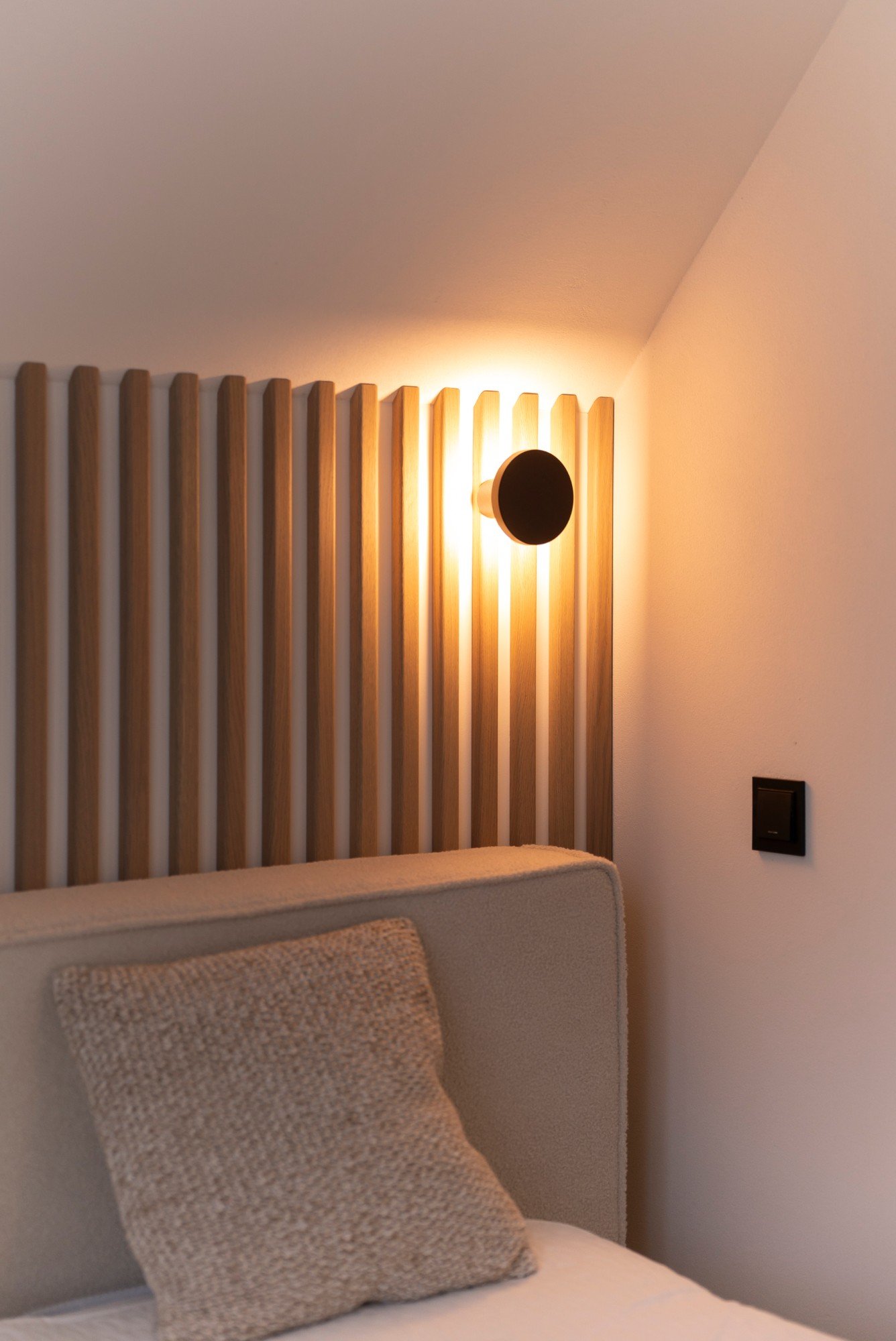 Guļamistaba ir projektēta kā privāta atpūtas telpa, kurā dominē dabīgi materiāli un vizuāls miers. Gaišā koka mēbeles veido vienotu, estētiski tīru kompozīciju, bet aiz gultas esošā siena no vertikālām koka līstēm kļūst par smalku japandi stila akcentu.