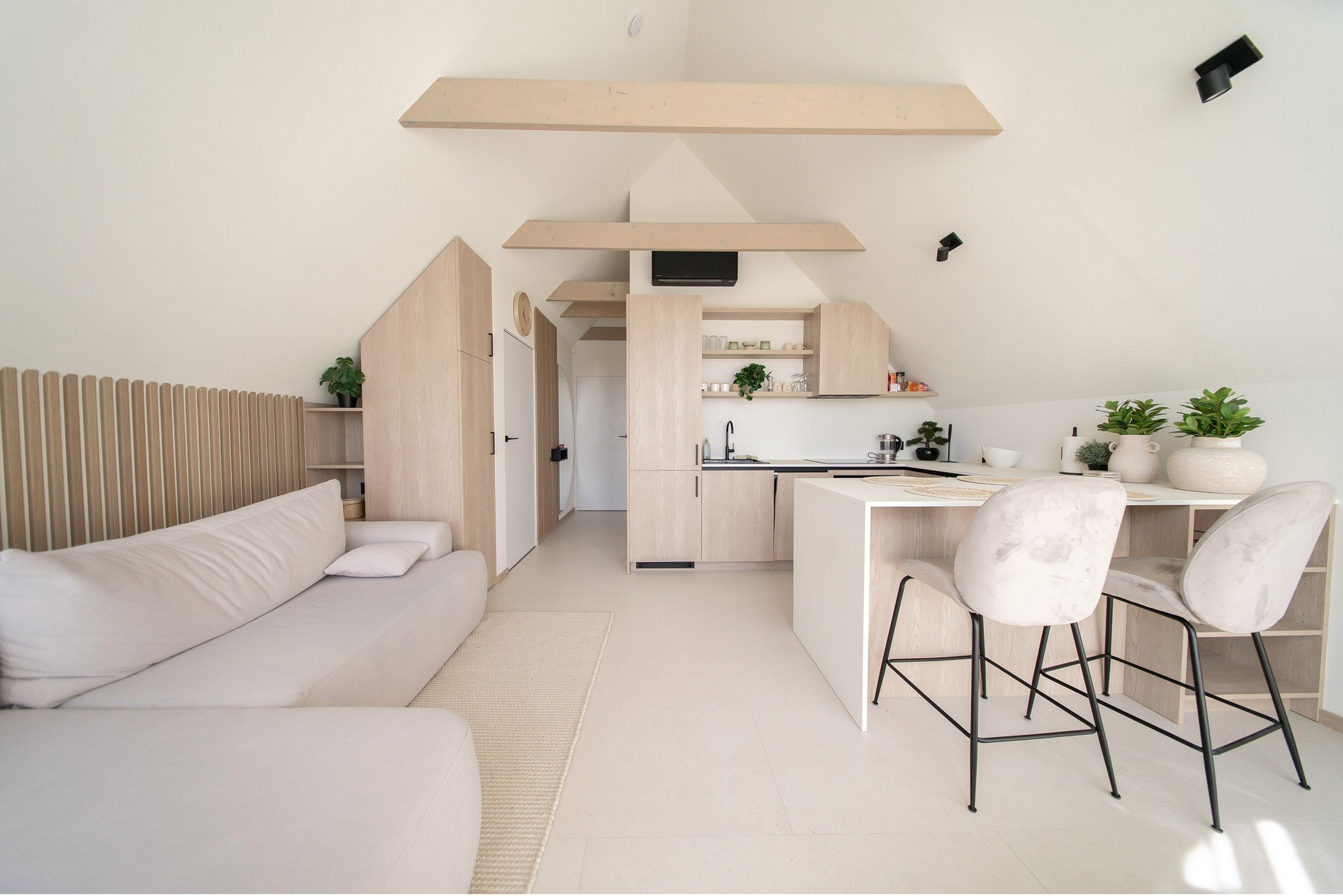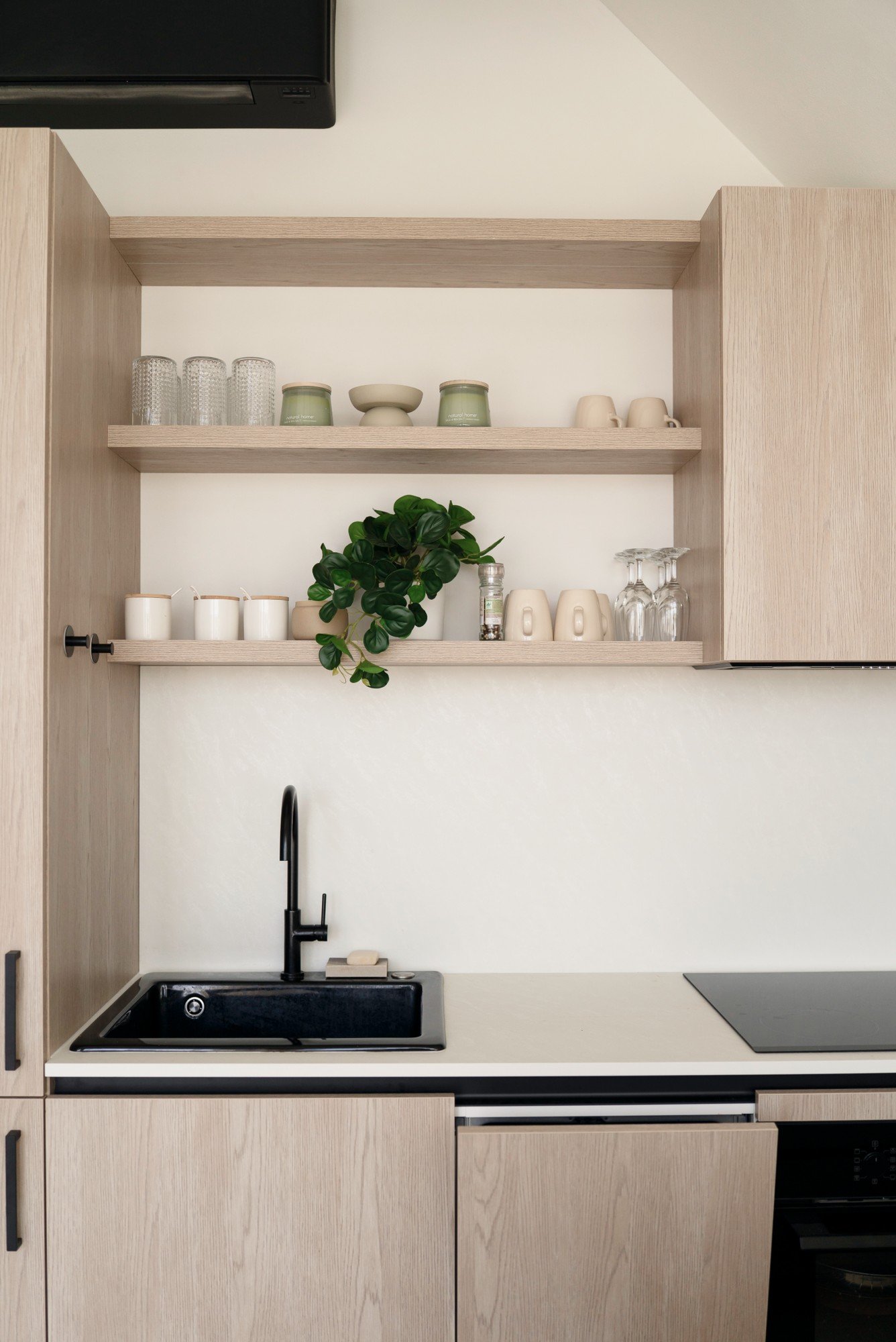 Gaišo toņu mēbeles ar apaļām formām mīkstina telpu un rada patīkamu atmosfēru. Minimālistiskā virtuve ar gaiša ozola tekstūras apdari un baltu darba virsmu saglabā tīrību un estētisko mieru, bet melnās detaļas piešķir smalku un modernu akcentu.