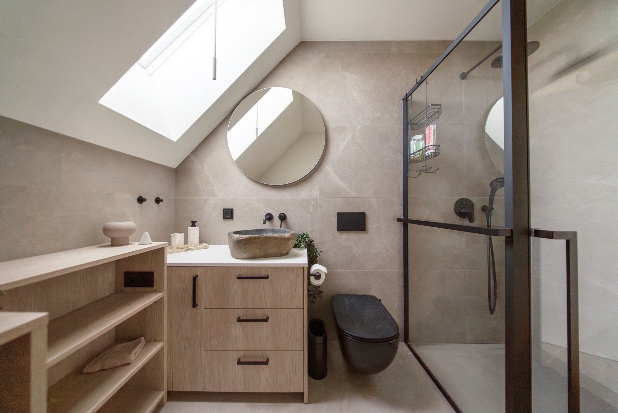 Vannas istaba ir projektēta kā moderna, dabiskuma pilna SPA telpa. Silto toņu flīzes tiek apvienotas ar koka detaļām un melniem akcentiem – dušas kabīnes rāmi, jaucējkrāniem un tualetes podu –, kas interjeram piešķir mūsdienīgu kontrastu.