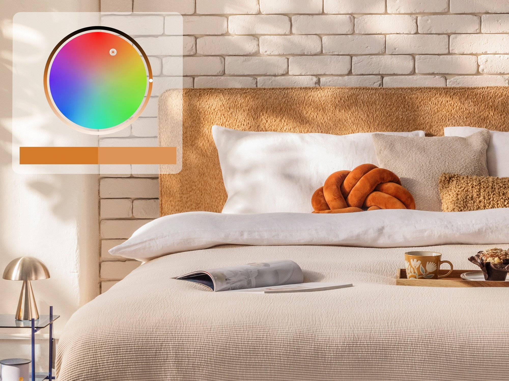 Oranžā krāsa parādās ne tikai uz galdiņa, bet arī uz spilvena izšuvuma.