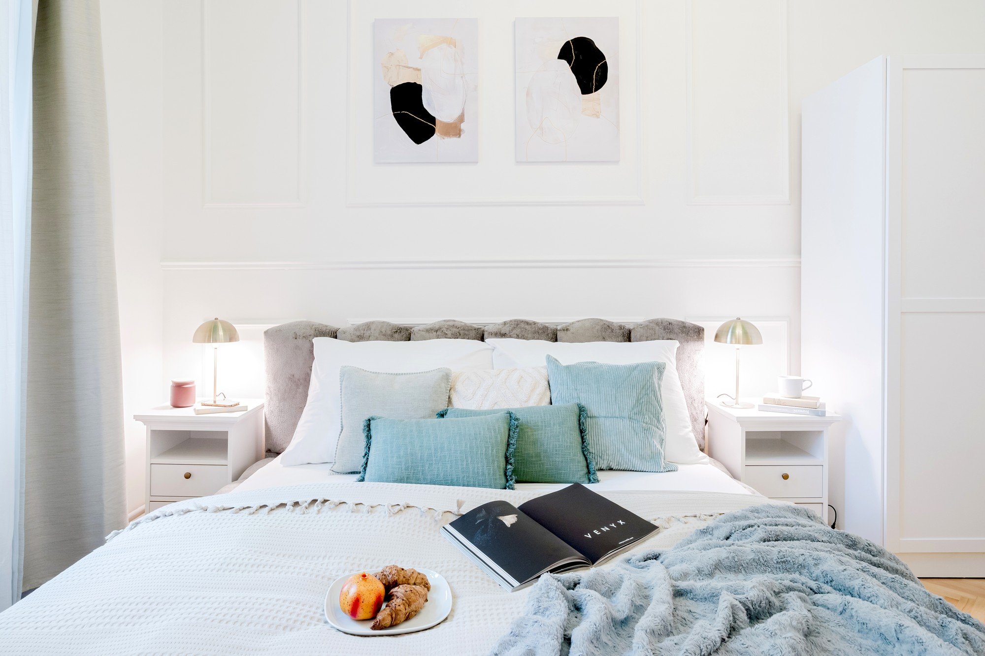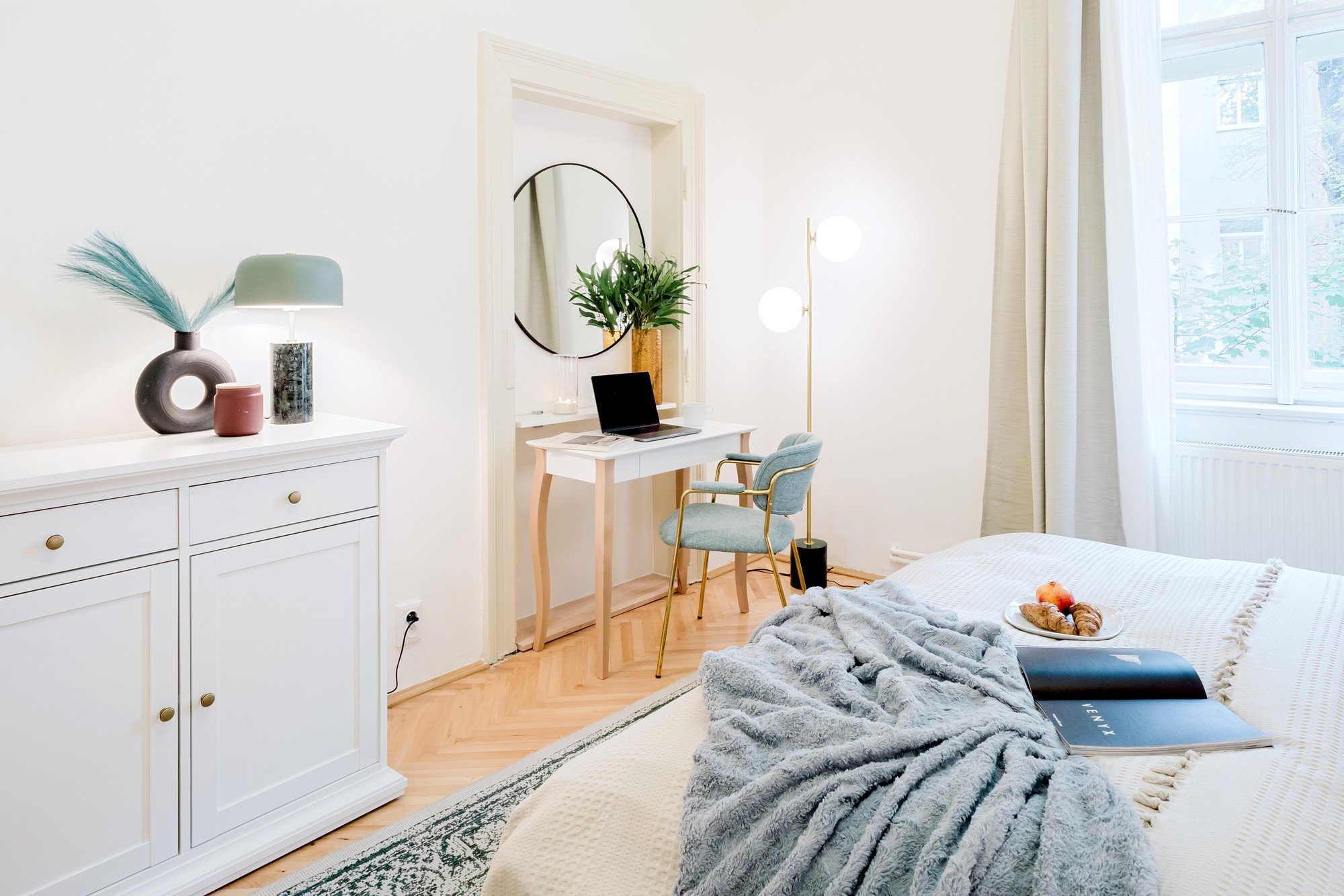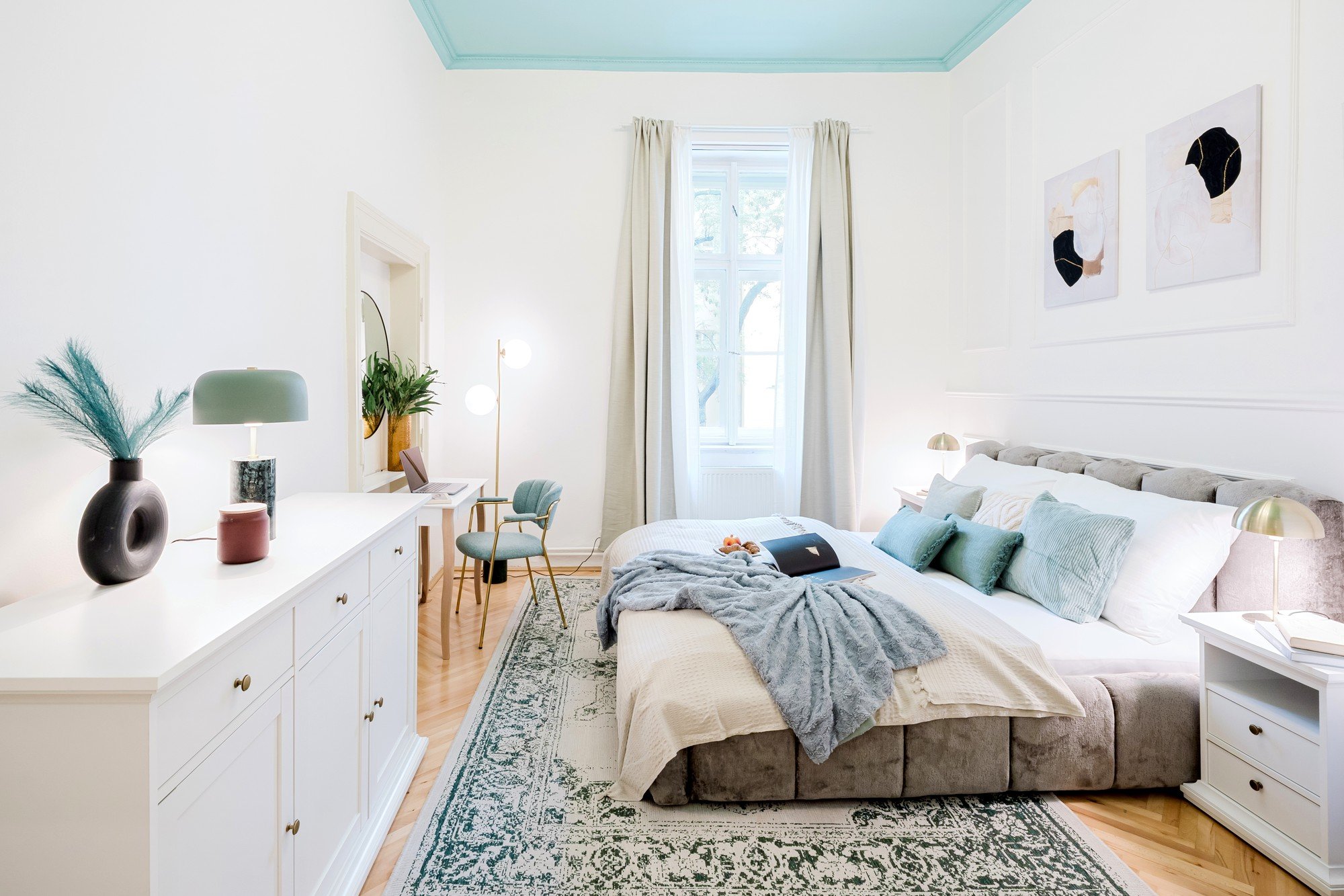 Trīsistabu dzīvoklis, kas paredzēts īstermiņa īrei, ir izveidots klasiskā Prāgas mājā ar tipiskiem augstiem griestiem. Tieši to augstums kļuva par galveno iedvesmas avotu visam projektam. Krāsainie griesti piešķir interjeram izteiksmīgu raksturu un uzsver tā proporcijas, savukārt glamūra elementi, dekoratīvās līstes un zelta elementi apvieno visu dzīvokli vienā elegantā un atmiņā paliekošā veselumā.