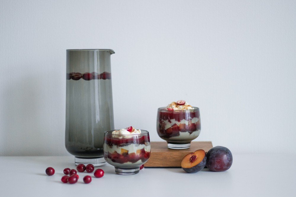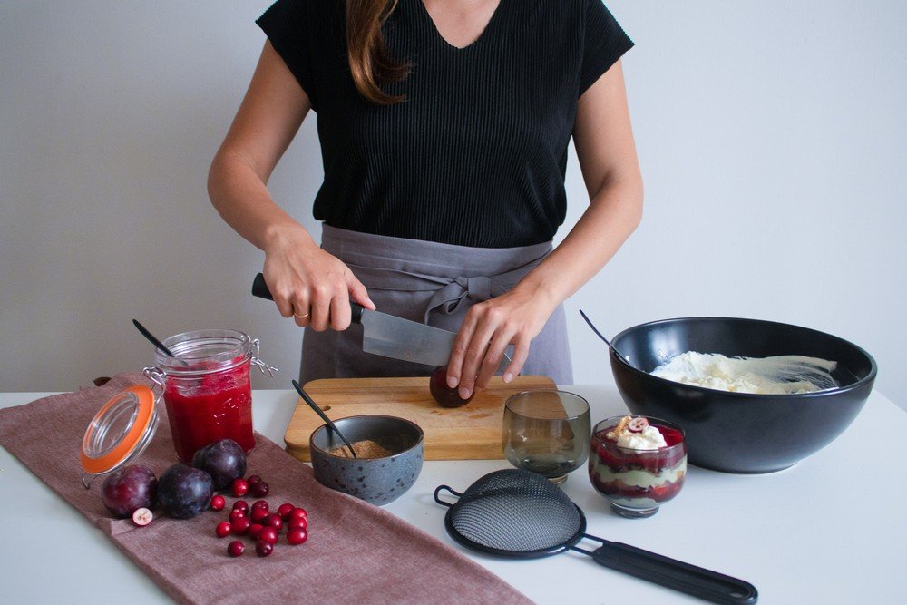 Sagatavo trauciņus vai glāzītes kārtojumam. Pirmajā kārtā liek krēmu, tad rudzu rīvmaizi, tad ievārījumu un tad vienā kārtā liek sagrieztās plūmes. Atkārto, kamēr trauciņi ir piepildīti.