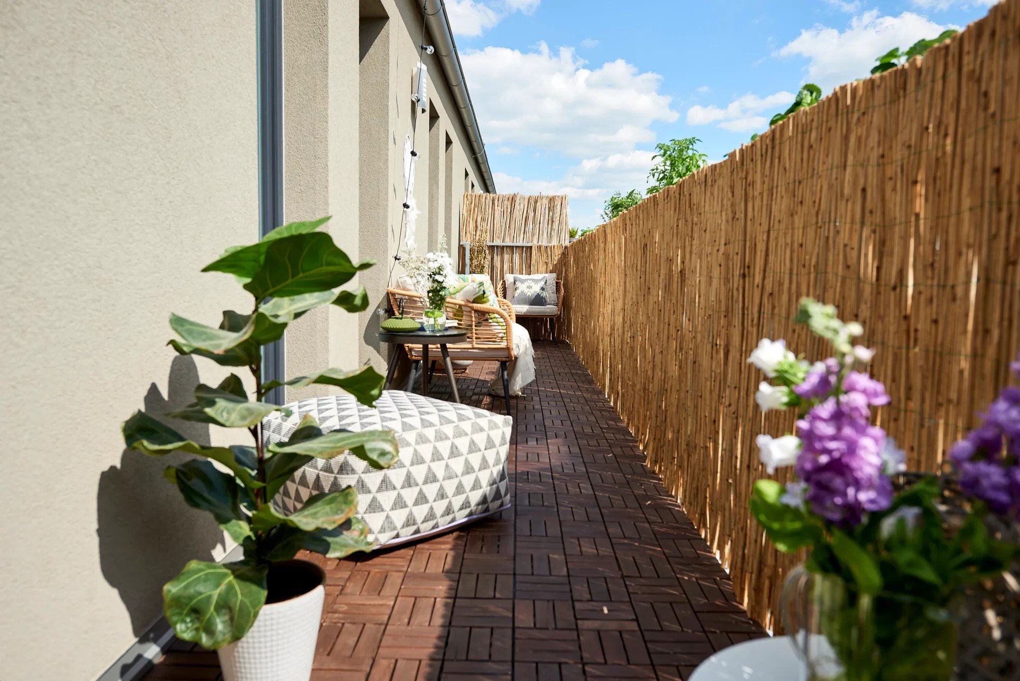 Uz garā, šaurā balkona mēbeles ir novietotas gar sienu – tādējādi eja paliek brīva, toties telpa izskatās plašāka.