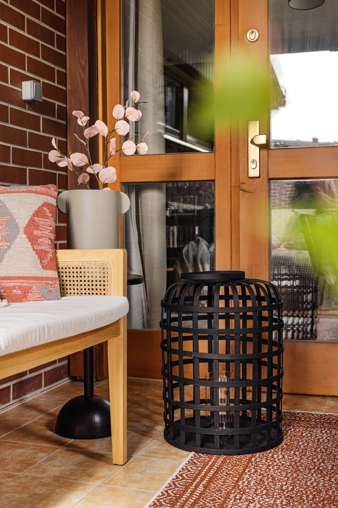 Pārvērtību laikā strādājām arī pie dārza mājas verandas labiekārtošanas. Vienkāršs koka dīvāns ar dažiem spilveniem bija viss, kas nepieciešams pietiekami ērtam un patīkamam atpūtas stūrītim.