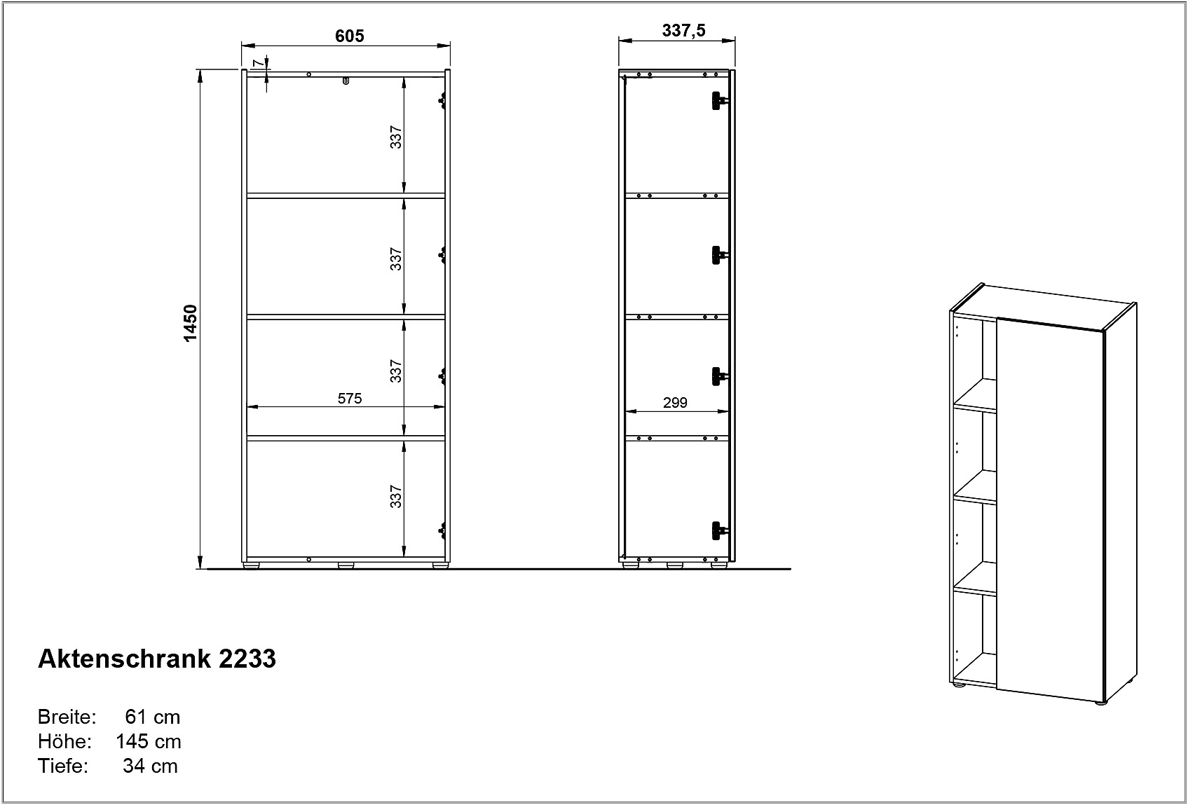 Grāmatplaukts Adrano no Germania piedāvā praktisku uzglabāšanas vietu. Tas ir aprīkots ar durvīm, aiz kurām ir trīs fiksēti plaukti ar kravnesību līdz 10 kg. Grāmatplauktam ir pieci melni plastmasas slīdņi. Durvīm nav rokturu, un tās var uzstādīt labajā vai kreisajā pusē. Apdare ir izturīga pret skrāpējumiem, malas ir triecienizturīgas. Tas ir ražots Vācijā.