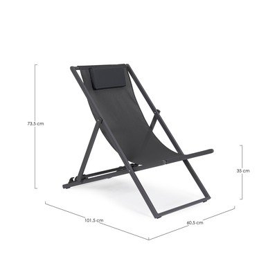 Tā konstrukcija ļauj regulēt atzveltni trīs dažādos stāvokļos, lai jūs vienmēr varētu atrast sev ērtāko. Atpūtas krēsls ir izgatavots no izturīga metāla rāmja un izturīga auduma, kas ir viegli kopjams. Vēl lielākam komfortam tas ir aprīkots ar nelielu galvas spilvenu.