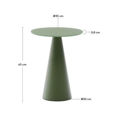 Tā apaļā virsma ir izgatavota no rūdīta stikla, kas apstrādāts ar īpašu pārklājumu pret pirkstu nospiedumiem, nodrošinot vienmērīgu un izturīgu virsmu. Galdiņš balstās uz koniskas formas tērauda pamatnes, kas ir pārklāta ar pulverkrāsu. Šis pārklājums veido stipru un noturīgu slāni, pasargājot pamatni no triecieniem, skrāpējumiem un nodiluma. Turklāt pamatne ir aprīkota ar īpašiem elementiem, lai pasargātu jūsu grīdas segumu.