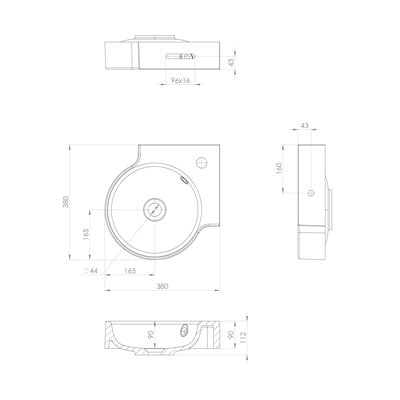 Stūra, no minerālu kompozītmateriāla, apaļa, balta, platums 38 cm, dziļums 38 cm, augstums 11 cm