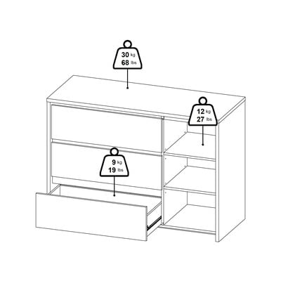 Kumodes kreisajā pusē ir trīs ietilpīgas atvilktnes, savukārt labajā pusē aiz durvīm slēpjas skapītis ar diviem regulējamiem plauktiem. Vienkāršo un moderno izskatu papildina funkcionalitāte, kas atvieglo mantu sakārtošanu.