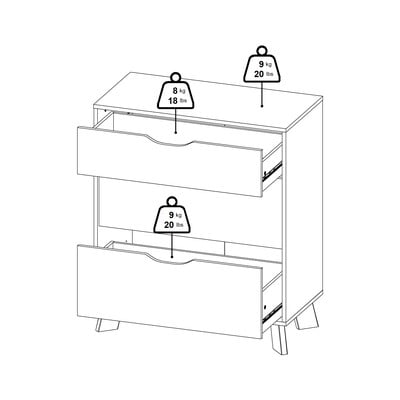 Tās izmēri ir 79x92x40 cm, un tā piedāvā trīs plašas atvilktnes uz riteņiem, kas atvieglo lietošanu. Baltās atvilktņu priekšas kontrastē ar rāmja dabīgās krāsas ozolkoka imitāciju, radot modernu un daudzpusīgu izskatu. Minimālistiskais dizains ar izgriezumiem rokturu vietā un slīpajām kājām papildina kumodes stilu.