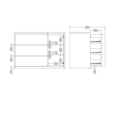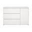 Kumodes kreisajā pusē ir trīs ietilpīgas atvilktnes, savukārt labajā pusē aiz durvīm slēpjas skapītis ar diviem regulējamiem plauktiem. Vienkāršo un moderno izskatu papildina funkcionalitāte, kas atvieglo mantu sakārtošanu.