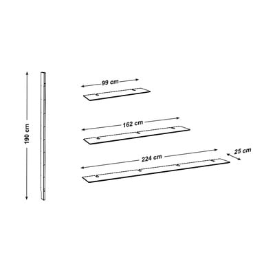 Garākā plaukta izmēri: 224 x 2 x 25 cm