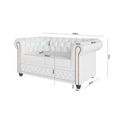 No ādas imitācijas, Chesterfield, balts, ūdensizturīgs/mājdzīvniekiem piemērots/pret traipiem noturīgs, divvietīgs, platums 148 cm