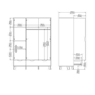 Šim plašajam skapim ar ozolkoka imitāciju ir trīs durvis, no kurām vienas ir aprīkota ar spoguli. Iekšpusē atradīsiet divus regulējamus un divus fiksētus plauktus, kā arī drēbju stieni. Skapja apakšdaļā atrodas trīs plašas atvilktnes. Skapja izmēri ir 147x201x58 cm, un tas nodrošina pietiekami daudz vietas apģērbu un piederumu uzglabāšanai.