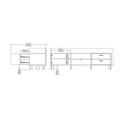 Tā izmēri ir 182x62x51 cm, un tajā ir pietiekami daudz vietas televizoram un citām iekārtām. Baltā un ozolkoka imitācijas kombinācija rada mūsdienīgu izskatu. TV galdiņam ir divas atvilktnes, slēgts skapītis un atvērta telpa ar plauktiem, kas nodrošina dažādas uzglabāšanas iespējas. Integrētā kabeļu pārvaldības sistēma nodrošina tīru un sakoptu izskatu.