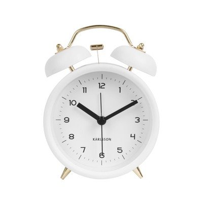 Klasiska modinātāja forma, kluss mehānisms, silti balta krāsa.