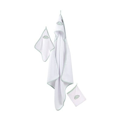 Roba dvieļu komplekts Happy Cloud ir ideāli piemērots bērnu aprūpei. Komplektā ietilpst dvielis ar kapuci (80 x 80 cm), mazais dvielis (30 x 30 cm) un mazgāšanas dvielis (16 x 20 cm).