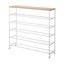 Zīmola YAMAZAKI apavu statīvs Tower ir praktisks risinājums jūsu priekšnama sakārtošanai. Šis piecu līmeņu metāla statīvs ir aprīkots ar riteņiem un bremzēm, kas atvieglo tā pārvietošanu un nodrošina stabilitāti, kad tas ir novietots. Augšpusē ir dabīgā finiera plaukts, kas lieliski noderēs sīkumu novietošanai. Tajā var ievietot līdz pat 20 apavu pāriem, atkarībā no to izmēra un formas. Papildu funkcionalitātei sānos ir divi āķīši, kas lieliski piemēroti kurpju roktura vai lietussarga pakāršanai. Augšējā plaukta kravnesība ir 2 kg, katrā stāvā var novietot 3 kg, bet āķu kravnesība ir 500 g.
