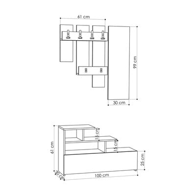 Šis priekšnama komplekts sastāv no apavu statīva (100 x 61 x 30 cm), spoguļa (30 x 99 cm) un sienas pakaramā ar platumu 61 cm.