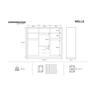 No MDFVirsmas apdare: laminātsBaltsPlatums 255 cmAugstums 217 cmDziļums 65 cm