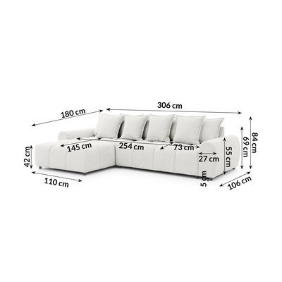 Ar kreiso stūri/ar zvilni, balts, ūdensizturīgs/pret traipiem noturīgs, četrvietīgs, platums 306 cm