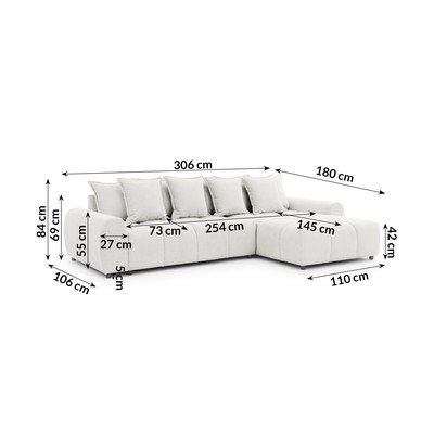 Ar labo stūri/ar zvilni, balts, ūdensizturīgs/pret traipiem noturīgs, četrvietīgs, platums 306 cm