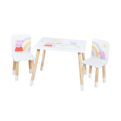 Šajā bērnu mēbeļu komplektā ir galds un divi krēsli, kas paredzēti ērtai un drošai sēdēšanai. Tā kompaktais izmērs padara to ideāli piemērotu bērna istabai vai rotaļu zonai. Krēslu sēdekļa augstums ir 28 cm, un to kopējie izmēri ir 54 × 26,5 × 26,5 cm. Galda izmēri ir 49 × 60 × 50 cm.