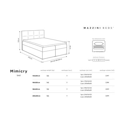 Komplektā ietilpst: vidēji stingrs atsperu matracis (3/5) ar 838 atsperēm, uz sāniem atverami glabāšanas nodalījumi un 7 cm augsts virsējais matracis (toperis).