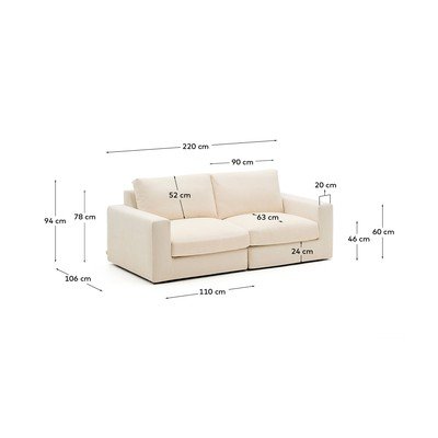 Kave Home dīvāns Alea ir stila un praktiskuma apvienojums. Sēdekļu spilveni ir izgatavoti no 30 kg/m³ blīvuma put\am un pirmšķiedras mikrošķiedras slāņa, kas nodrošina vidēju sēdēšanas stingrību un sajūtu, it kā sēdētu uz mākoņa.
