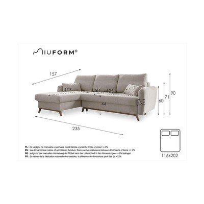 Salokāms/ar uzglabāšanas vietuAr kreiso stūri/ar zvilniBēšsTrīsvietīgsPlatums 235 cmDziļums 157 cmSēdekļa dziļums 50 cm