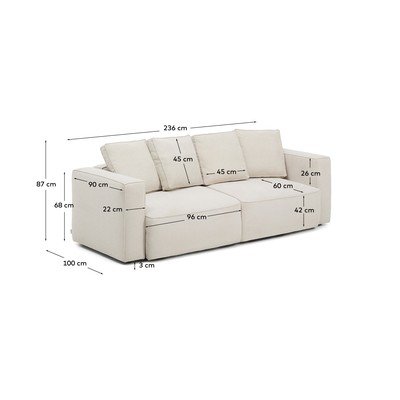 Dīvāns MarelaNo šenila auduma, salokāms, pret traipiem noturīgs, bēšs, trīsvietīgs, platums 236 cm