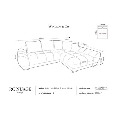 Stūra dīvāns NuageSamta, salokāms/ar uzglabāšanas vietu, ar labo stūri/ar zvilni, bēšs, ūdensizturīgs/pret traipiem noturīgs, četrvietīgs, platums 285 cm