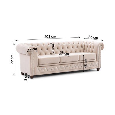 Samta, salokāms, Chesterfield, bēšs, ūdensizturīgs/pret traipiem noturīgs, divvietīgs, platums 203 cm