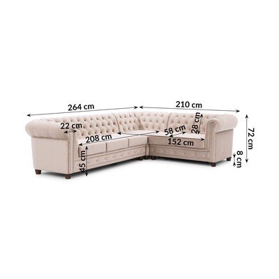 Samta, salokāms, Chesterfield, ar labo stūri/L veida, bēšs, ūdensizturīgs/pret traipiem noturīgs, četrvietīgs, platums 264 cm