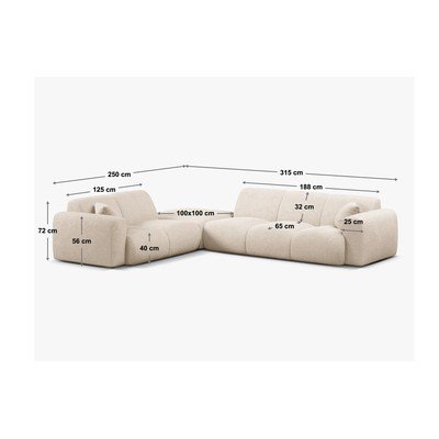 No buklē auduma, ar kreiso stūri/L veida, bēšs, vairākvietīgs, platums 315 cm, dziļums 250 cm, sēdekļa dziļums 68 cm