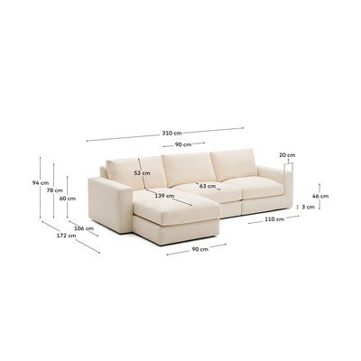 No šenila audumaAr kreiso stūri/ar zvilniAr noņemamu spilvendrānuBēšsČetrvietīgsPlatums 310 cmDziļums 172 cmSēdekļa dziļums 63 cm