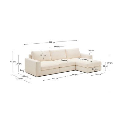 No šenila audumaAr labo stūri/ar zvilniAr noņemamu spilvendrānuBēšsČetrvietīgsPlatums 310 cmDziļums 172 cmSēdekļa dziļums 63 cm