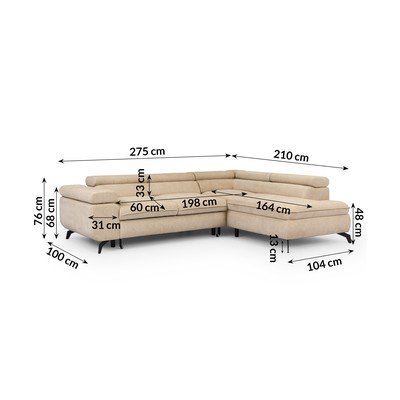 No šenila auduma, regulējams/salokāms/ar uzglabāšanas vietu, ar labo stūri/L veida, bēšs, mājdzīvniekiem piemērots/pret traipiem noturīgs, četrvietīgs, platums 275 cm