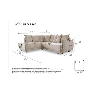 VelvetaSalokāms/ar uzglabāšanas vietuAr kreiso stūri/L veidaBēšsČetrvietīgsPlatums 247 cmDziļums 191 cmSēdekļa dziļums 79 cm