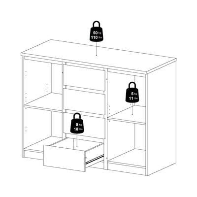 Tās izmēri ir 121x91x50 cm, un tā piedāvā daudz vietas jūsu mantām. Četras atvilktnes vidū nodrošina vieglu piekļuvi bieži izmantotiem priekšmetiem, savukārt divās sānu durtiņās ir paslēpti divi regulējami plaukti elastīgai uzglabāšanai.