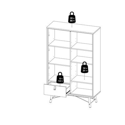 Tās izmēri ir 102x162x40 cm, un, pateicoties divām durvīm, vienai atvilktnei un pieciem plauktiem, tajā ir daudz vietas uzglabāšanai. Kreisajā stiklotajā daļā ar plauktiem var izvietot dekorācijas, savukārt labajā daļā ar durvīm ir diskrēta uzglabāšanas vieta. Melnās metāla kājas nodrošina stabilitāti un izceļ moderno dizainu.