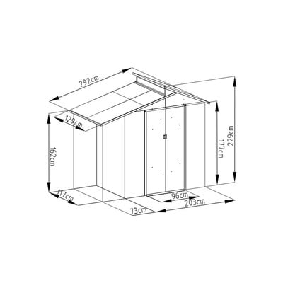 Divas bīdāmās durvis ar izmēriem 96 x 177 cm nodrošina ērtu piekļuvi uzglabātajiem priekšmetiem. Mājiņa ir izgatavota no kvalitatīvām karsti cinkota tērauda loksnēm ar biezumu 0,25–0,30 mm un ventilācijas režģiem. Loksnes kopā satur 0,5–0,8 mm biezs cinkota tērauda rāmis un perimetra rāmis, kas jānostiprina pie līdzenas pamatnes (betona, flīžu, koka grīdas...), izmantojot komplektā iekļautās enkurskrūves.