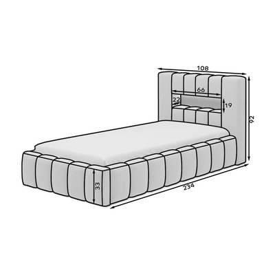 Piezīme: plaukts gultas galvgalī ir 19 cm augsts un 20 cm dziļš, taču mīksto malu dēļ izmēri var atšķirties līdz pat 2 cm.