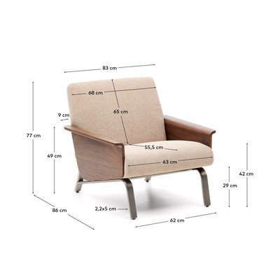 Krēsla konstrukcija apvieno izturīgu 18 mm saplāksni, kas pārklāts ar ozolkoka finieri, un vizuāli pievilcīgus, tīru līniju roku balstus. Matēta nerūsējošā tērauda kājas ar 1,8 mm diametru pasvītro moderno un stabilo izskatu. Krēsls piedāvā ideālu vidēju sēdekļa stingrību ikdienas lietošanai, pateicoties pārdomātai siksnu, atsperu un augsta blīvuma putu slāņu (35 kg/m³ un 40 kg/m³) kombinācijai, kas nodrošina izturību un lielisku komfortu.