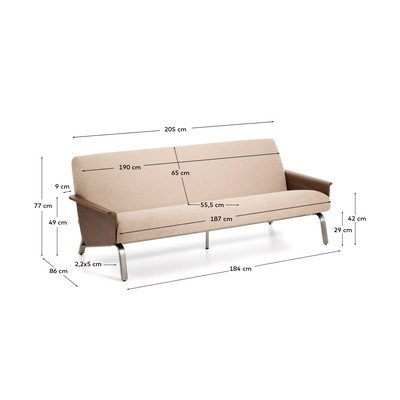 Dīvāna konstrukcijā apvienots izturīgs 18 mm saplāksnis, kas pārklāts ar ozolkoka finieri, un vienkāršas roku balstu līnijas. Matēta nerūsējošā tērauda kājas ar 1,8 mm diametru piešķir modernu un stabilu izskatu visam dizainam. Sēdeklis piedāvā vidēju stingrību, kas ir ideāli piemērota ikdienas lietošanai, pateicoties pārdomātai siksnu, atsperu un augsta blīvuma putu slāņu (35 kg/m³ un 40 kg/m³) kombinācijai, kas nodrošina izturību un lielisku komfortu.