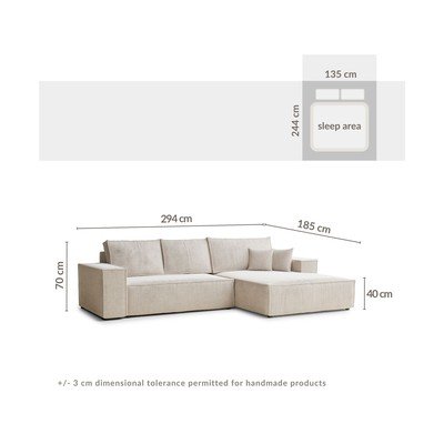 No šenila audumaSalokāms/ar uzglabāšanas vietuAr labo stūri/ar zvilniGaiši brūnsČetrvietīgsPlatums 294 cmDziļums 185 cmSēdekļa dziļums 65 cm