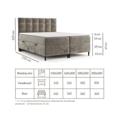 200x200 cmAr veļas kastiPolsterētaAr matraci/ar iekļautu matrača pārvalkuNo šenila audumaGaiši pelēka