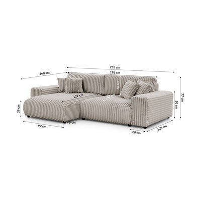 VelvetaSalokāms/ar uzglabāšanas vietuAr kreiso stūriGaiši pelēksŪdensizturīgs/pret traipiem noturīgsTrīsvietīgsPlatums 255 cm